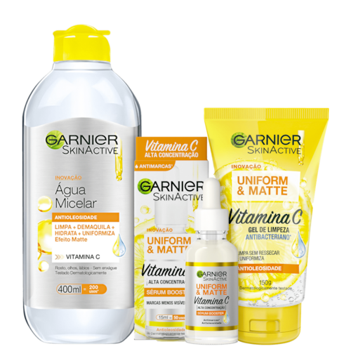 O Kit Garnier SkinActive Uniform & Matte Vitamina C conta com ação antioxidante, que combate os radicais livres e uniformiza a pele. Ideal para uma pele saudável e bonita.