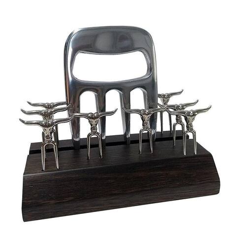 Kit Garra para Churrasco 4 Pontas com 8 mini garfos/espetinhos com suporte de madeiraMedidas do garra 4 pontas:Altura: 15 cmLargura: 10 cmMaterial: alumínio polidoMedidas dos mini garfos:Altura: 6,5 cmLargura: 5 cmMaterial: alumínio polidoAcompanha base de madeira: 18 cm x 8 cm x 3 cm aproximadamente