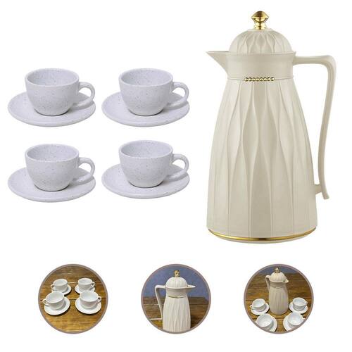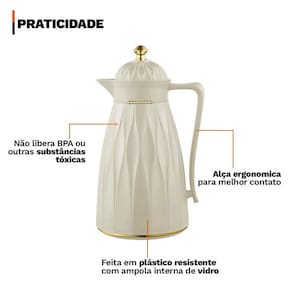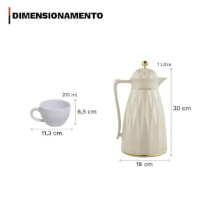 Distribuído por feheros shop Conjunto garrafa térmica café chá 1l premium click abre e fecha com 4 xícaras pires cerâmica 210ml Atenção Este conjunto foi desenvolvido para quem busca sofisticação, praticidade e qualidade em cada detalhe. A garrafa térmica 1 litro premium luxo conserva suas bebidas quentes ou frias por várias horas com máxima eficiência, enquanto o conjunto de 4 xícaras com pires em cerâmica premium adiciona charme e requinte à mesa posta. Ideal para transformar o café da manhã, reuniões de trabalho, visitas ou qualquer ocasião especial em momentos inesquecíveis. Informações do produto A garrafa térmica premium combina design moderno com funcionalidade, oferecendo praticidade no uso diário e elegância em qualquer ambiente. Com capacidade para 1 litro, é perfeita para conservar café, chá ou outras bebidas quentes e frias. Seu sistema click de abertura e fechamento garante agilidade, vedação eficiente e preservação da temperatura por mais tempo. As xícaras de cerâmica premium com capacidade de 210ml cada, acompanhadas de pires delicados, completam o conjunto com estilo e resistência. Compatíveis com micro-ondas, são fáceis de limpar e ideais para servir café ou chá com sofisticação, tornando este kit indispensável para compor a mesa posta com bom gosto e praticidade. Especificações técnicas do produto - design sofisticado e versátil que valoriza a mesa posta e combina com qualquer estilo de ambiente - sistema click de abertura e fechamento que proporciona praticidade, eficiência e evita vazamentos - isolamento térmico de alta qualidade que mantém líquidos quentes por até 6 horas e frios por até 12 horas - estrutura resistente produzida em polipropileno atóxico com ampola interna de vidro - acabamento premium com design moderno que une durabilidade e sofisticação - alça ergonômica que facilita o transporte com conforto e segurança - xícaras e pires em cerâmica premium de alta resistência, durabilidade e fácil limpeza - capacidade de 210ml em cada xícara, ideal para servir café ou chá em quantidades generosas - compatibilidade com micro-ondas, permitindo aquecer bebidas de forma prática e segura Ficha técnica do produto - capacidade garrafa: 1 litro - altura garrafa: 30 cm - peso garrafa: 650 g - material externo garrafa: polipropileno premium - material interno garrafa: ampola de vidro - sistema: click abre e fecha com vedação hermética - conservação: até 6 horas líquidos quentes e até 12 horas líquidos frios - alça: anatômica e ergonômica - capacidade xícaras: 210 ml cada - medidas xícaras: 11,3 cm comprimento, 8,8 cm largura, 6,5 cm altura - material xícaras e pires: cerâmica premium - quantidade peças conjunto: 4 xícaras e 4 pires Antes e depois do primeiro uso - antes do uso: lave a garrafa com água morna e sabão neutro para remover resíduos de fabricação. Realize o pré-aquecimento com água quente ou o pré-resfriamento com água fria conforme a bebida desejada. Lave as xícaras e pires com detergente neutro e esponja macia. - após o uso: lave a garrafa manualmente com sabão neutro e esponja macia, evitando produtos abrasivos e não utilize em micro-ondas, freezer, geladeira ou lava-louças. Para as peças em cerâmica evite choques térmicos e lave sempre com cuidado para preservar a durabilidade. Itens inclusos no pacote - 01 garrafa térmica café chá 1 litro premium click abre e fecha - 04 xícaras de cerâmica premium 210ml - 04 pires de cerâmica premium Todas as fotos são reais dos produtos. Qualquer dúvida, estamos à disposição. Dúvidas frequentes 01 - o kit é novo Acompanha 03 - a garrafa mantém a bebida quente por quanto tempo R: a tecnologia de isolamento térmico garante bebidas quentes por até 6 horas e frias por até 12 horas.