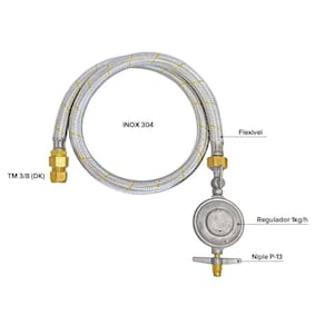 Especificações Técnicas Mangueira flexível: Revestida em aço inox 304 com borracha de alta resistência, conforme norma NBR 14955. Pressão máxima de trabalho: 7 bar. Temperatura máxima de operação: 120C. Dimensões da mangueira: 3/8 I x 1000 mm. Adaptador de aperto rápido: Para instalação prática e segura. Regulador de gás: Vazão de 1 kg/h modelo Aliança 503/10 , garantindo um fluxo estável e eficiente. Comprimento da mangueira: 100 cm. Diâmetro da mangueira: 1,6 cm.