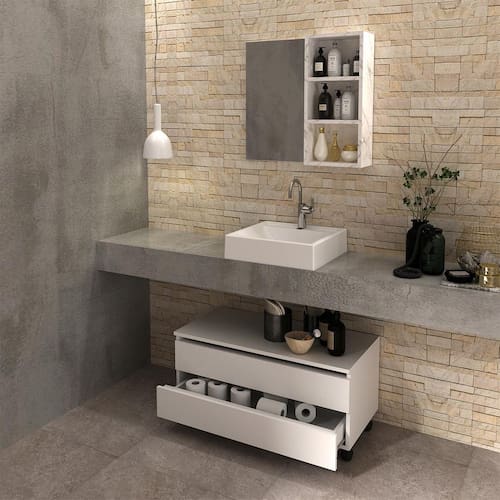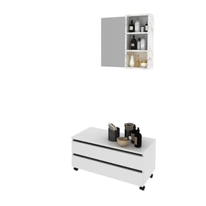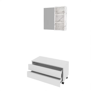 O Kit para Banheiro é a escolha ideal para dar um toque de elegância e organização ao seu espaço. Com um design contemporâneo, ele transforma o ambiente em um local mais convidativo e prático. Fabricado com materiais de alta qualidade, o kit oferece durabilidade e um visual sofisticado, tornando seu banheiro ainda mais funcional e bonito. CARACTERÍSTICAS TÉCNICAS: - Produzida em MDP de 15 mm - Acabamento UV na cor Branco e Mármore Branco - Acompanha Espelho - 2 Gavetas com Corrediças Metálicas - Puxador tipo Cava - Balcão com Rodízios *NÃO Acompanha Cuba *Kit Composto por Gabinete com Rodízios (3601) e Espelheira (3609) INFORMAÇÕES TÉCNICAS: 3603: Alt. 38 x Larg. 80 x Prof. 38,7 cm P. 14,75 kg 3609: Alt. 54 cm x Larg. 60 cm x Prof. 15,6 x P. 7,65 kg INFORMAÇÕES ADICIONAIS: - ATENÇÃO: Não trabalhamos e não nos responsabilizamos pela montagem do móvel. Antes da montagem conferir se o produto está de acordo com o que comprou, produto montado e danificado pela montagem não será aceito troca. Montagem e instalação por conta do comprador. - As imagens ambientadas são meramente ilustrativas e podem apresentar itens que não compõe o produto. As cores do produto podem variar de acordo com o monitor, a iluminação do ambiente ou sua percepção visual. - Limpeza: Deve ser feita com pano macio e seco ou levemente umedecido com água e sabão neutro. Não devem ser utilizados abrasivos como palha de aço e objetos cortantes. -Garantia para defeitos de fabricação conforme Código de Defesa do Consumidor.