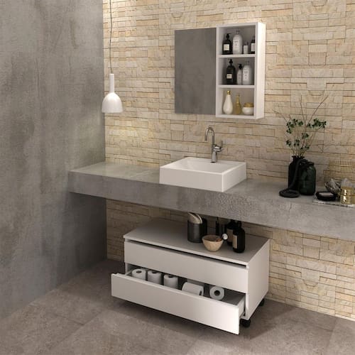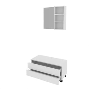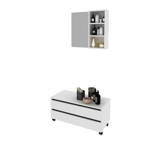 O Kit para Banheiro é a escolha ideal para dar um toque de elegância e organização ao seu espaço. Com um design contemporâneo, ele transforma o ambiente em um local mais convidativo e prático. Fabricado com materiais de alta qualidade, o kit oferece durabilidade e um visual sofisticado, tornando seu banheiro ainda mais funcional e bonito. CARACTERÍSTICAS TÉCNICAS: - Produzida em MDP de 15 mm - Acabamento UV na cor Branco - Acompanha Espelho - 2 Gavetas com Corrediças Metálicas - Puxador tipo Cava - Balcão com Rodízios *NÃO Acompanha Cuba *Kit Composto por Gabinete com Rodízios (3601) e Espelheira (3609) INFORMAÇÕES TÉCNICAS: 3603: Alt. 38 x Larg. 80 x Prof. 38,7 cm P. 14,75 kg 3609: Alt. 54 cm x Larg. 60 cm x Prof. 15,6 x P. 7,65 kg INFORMAÇÕES ADICIONAIS: - ATENÇÃO: Não trabalhamos e não nos responsabilizamos pela montagem do móvel. Antes da montagem conferir se o produto está de acordo com o que comprou, produto montado e danificado pela montagem não será aceito troca. Montagem e instalação por conta do comprador. - As imagens ambientadas são meramente ilustrativas e podem apresentar itens que não compõe o produto. As cores do produto podem variar de acordo com o monitor, a iluminação do ambiente ou sua percepção visual. - Limpeza: Deve ser feita com pano macio e seco ou levemente umedecido com água e sabão neutro. Não devem ser utilizados abrasivos como palha de aço e objetos cortantes. -Garantia para defeitos de fabricação conforme Código de Defesa do Consumidor.