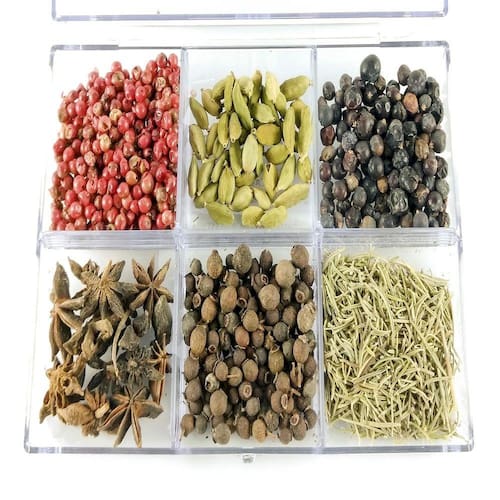 Zimbro 10 gramas. Cardamomo 10 gramas. Pimenta rosa 10 gramas. Alecrim 10 gramas. Anis estrelado 10 gramas. Pimenta jamaica 10 gramas. Nosso kit portátil feito acrílico de alta qualidade, conta com 6 especiarias que rendem ate 90 drinks sem perder a qualidade e o sabor que um gin & tônica precisa. Graças ao rigoroso controle de qualidade que nossas especiarias passam para sempre manterem seu frescor e o aroma e sabor mais puro, para seus momentos. Modo de preparo. Em um copo adicione 2 pedras de gelo. Mexa com uma colher até gelar o copo. Retire o excesso de água. Adicione 50 ml de gin. Adicione o mix de especiarias do seu gosto. Aguarde de 1 a 3 minutos. Misture com uma colher todas as especiarias. Adicione gelo e água tônica. Mexa levemente com auxílio de uma colher.