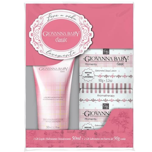 O Kit Giovana Baby Eterno Encanto Classic conta com uma Loção Hidratante de 50ml que proporciona para sua pele uma hidratação profunda, pele macia e a deixando perfumada durante o dia a dia, também conta com Dois Sabonetes em Barra de 90g que limpa sua pele de suavemente e a deixando com um delicioso aroma, pela fragrância da Giovana Baby. Sendo assim um a ótima opção para você que gosta de manter sua pele sempre hidratada, limpinha e cheirosa.