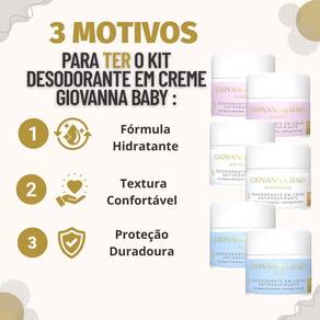 Com sua formulação em creme e a delicada fragrância Blue, este desodorante antiperspirante é a escolha perfeita para o uso diário, proporcionando uma sensação de frescor duradoura. Adquira o kit e tenha sempre à mão a qualidade Giovanna Baby.