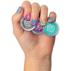 Surpreenda suas amigas com uma manicure brilhante e colorida. Este conjunto de esmaltes vem com ferramentas para criar unhas ainda mais coloridas e estilosas.Escolha entre seis potes de glitter de cores vibrantes e desenhe sua própria cor! Adicione adesivos à suas unhas. Eles são o toque final perfeito!!