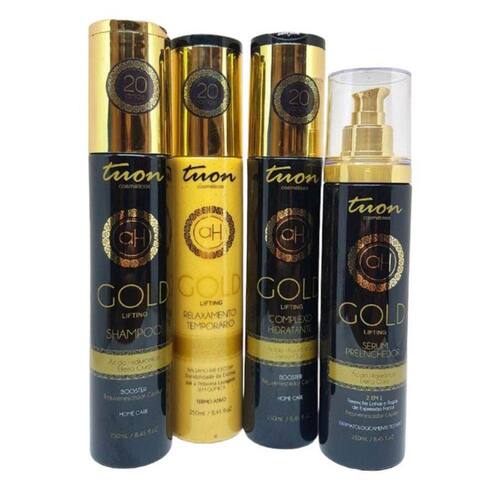 KIT GOLD LIFTING SHAMPOO, CONDICIONADOR, FINALIZADOR, SÉRUM - TUON - DESCRIÇÃO COMERCIAL: A linha Gold possui como princípio ativo o ácido Hialurônico, que age como rejuvenescedor capilar e facial. O ácido hialurônico é uma proteína que nosso corpo produz para absorver grandes quantidades de água, com a função de manter a elasticidade e hidratação da pele e do cabelo. Ele é considerado a chave da juventude para seus cabelos e pele. - DETALHE TÉCNICO: O ácido hialurônico no cabelo tem como principal função a regeneração dos fios. Além de possuir ação hidratante, esse ativo também funciona como um grande preenchedor. Ele preenche e protege a fibra capilar, evitando a abertura das cutículas e mantendo todo o tratamento no interior dos fios. - APLICAÇÃO: Shampoo: O Shampoo Gold Lifting possui propriedades suaves ao lavar os cabelos, promovendo hidratação, brilho e maleabilidade dos fios ao toque. Desenvolvido a partir de ingredientes naturais e com base no princípio da necessidade dos cabelos sem brilho e hidratação, hidrata os fios para rejuvenescer a estrutura de ponta a ponta. O Shampoo tem um equilíbrio de agentes que limpam suavemente e condicionam os fios, promovendo maciez aos cabelos sem deixá-los estáticos. Além disso, forma um filme de proteção que aumenta a resistência e elasticidade dos fios. Não contém sal, parabenos, petrolatos ou silicones e não é testado em animais.Condicionador:A Máscara Gold Lifting possui propriedades altamente condicionantes que promovem desembaraço instantâneo, hidratação, brilho e maleabilidade dos fios tanto ao toque úmido quanto após a secagem. Desenvolvida a partir de ingredientes naturais e baseada na necessidade de cabelos que precisam de hidratação e melhora na textura da fibra capilar, a máscara tem um equilíbrio de agentes que condicionam e protegem os fios, formando um filme de proteção para prolongar o efeito rejuvenescedor nos cabelos. Não contém parabenos, petrolatos ou silicones e não é testada em animais.Finalizador:Relaxamento Temporário AH Gold Lifting atua no desempenho da escovação, alinhamento natural dos fios, sem química, relaxa os cachos e alisa os fios ondulados sob ação do calor. Bloqueia a unidade e formação de frizz. Mantem os cabelos macios e hidratados sem aspecto oleoso até a próxima lavagem. O produto não contém Parabenos, Petrolatos ou Silicones, além de não ser testado em animais.Sérum:Sérum Preenchedor com múltiplos benefícios, que intensifica os níveis de ácido hialurônico da pele devido a concentração do ativo associado aos componentes da formulação de base, promove o BLUR uma transformação instantânea da superfície e cor da pele, refletindo a luz e trazendo um efeito óptico de imediato que alisa e cobre as imperfeições. O produto não contém Parabenos, Petrolatos ou Silicones, além de não ser testado em animais.Botox:O Botox capilar é um tratamento para os cabelos que tem como finalidade hidratar profundamente, nutrir e reconstruir os fios. Ele age preenchendo as fissuras e as escamas dos cabelos, deixando-os mais macios, sedosos e com brilho. Além disso, o botox capilar ajuda a reduzir o volume e o frizz dos cabelos, deixando-os mais alinhados e fáceis de pentear. Esse tratamento não contém forma. O produto não contém Parabenos, Petrolatos ou Silicones, além de não ser testado em animais. - COMPOSIÇÃO: Shampoo:Aqua, Sodium Lauryl Sulfate, Guar Hydroxypropyltrimonium Chloride, Cocamidopropyl Betaine, Cocamide Dea, Glycerin, Polyquaternium-10, Citric Acid, Sodium Hyaluronate, Phenoxyethanol, Disodium Edta, Parfum, Alpha-Isomethyl Ionone, Benzyl Salicylate, Coumarin, Hydroxyisohexyl 3-Cyclohexene Carboxaldehyde, Ci 77019, Ci 77491, Ci 77891. Condicionador:Aqua, Cetrimonium Chloride, Behentrimonium Chloride, Stearamidopropyl Dimethylamine, Ceteareth-20, Cocos Nucifera Oil, Amodimethicone, Trideceth-12, Glycerin, Peg-90, Sodium Hyaluronate , Phenoxyethanol , Parfum, Alpha-Isomethyl Ionone, Benzyl Salicylate, Coumarin, Hydroxyisohexyl 3-Cyclohexene Carboxaldehyde, Ci 77019, Ci 77491, Ci 77891.Finalizador:Aqua, Behentrimonium Methosulfate, Cetearyl Alcohol, Amodimethicone, Trideceth-12, Laureth-23, Laureth-4, Glycerin , Cocos Nucifera Oil, Dimethiconol ,Cyclomethicone, Dimethicone, Dimethicone Crosspolymer, Cyclopentasiloxane, Disodium Edta, Citric Acid, Sodium Hyaluronate, Polyquaternium-39, Phenoxyethanol, Parfum, Alpha-Isomethyl Ionone, Hexyl Cinnamal, Hydroxyisohexyl 3-Cyclohexene Carboxaldehyde, Benzyl Salicylate, Linalool, Coumarin, Ci 77019, Ci 77491, Ci 77891. Sérum:Aqua, Cyclomethicone, Dimethicone Crosspolymer, Dimethiconol, Glycerin, Hydroxyethylcellulose, Lactic Acid, Sodium Hyaluronate, Phenoxyethanol, Parfum, Hydroxyisohexyl 3-Cyclohexene Carboxaldehyde, Alpha-Isomethyl Ionone, Benzyl Salicylate, Coumarin.Botox:Aqua, Peg 90M, Hydroxethycellilose, Phenoxyethanol, Polyqusternium 10, Stearamidopropyl Dimethylamine, Ci 77019, Ci 77891, Ci 77491, Alpha-Isomethyl, Ionone, Benzyl Salicylate, Coumarin, Hexyl Cinamal, Hydroxy Isohexyl 3- Cyclohexene Carboxaldehyde, Linalool, Sodium Hyaluronate, Parfum - GARANTIA: 3 meses de garantia, contra defeitos de fabricação. - MODO DE USAR: Shampoo: Lave os cabelos com o Shampoo Gold Lifting. Aplique sobre os cabelos molhados e massageie suavemente por alguns instantes, obtendo uma espuma cremosa. Enxágue bem e, se necessário, repita o processo. Em seguida, aplique o Complexo Hidratante Gold Lifting. Condicionador: Aplique o Complexo Hidratante Gold Lifting nos cabelos lavados e desembarace delicadamente. Deixe agir por até 5 minutos e enxágue. Para potencializar o tratamento, finalize com o Sérum Preenchedor Gold Lifting. Finalizador: Aplicar uma pequena quantidade na palma da mão do Relaxamento Temporário Gold Lifting, emulsione friccionando-as e aplique uniformemente sobre os cabelos, da raiz até as pontas. Para um resultado do liso perfeito finalizar com sec