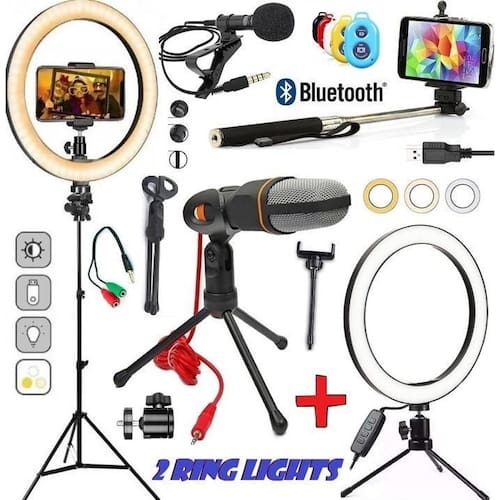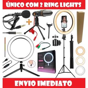 Kit microfone de mesa + microfone lapela + 2 iluminadores ring light + tripé 2,10m em alumínio. O único com 2 ring lights