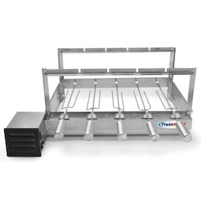 Acompanha 5 espetos em aço inox 430 e possui cabo em alumínio que proporciona uma durabilidade maior. Giram em rotação constante ao acionar motor, possui rotação cruzada onde os espetos giram em sentidos opostos para evitar interferência de um espeto e outro.