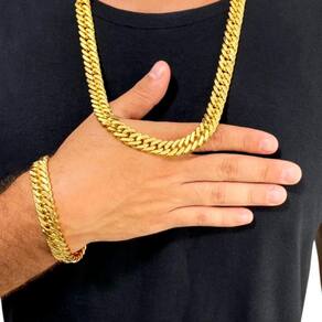 Kit Grumet 13mm Corrente + Pulseira Banhado a Ouro 18K Detalhes do Produto: Material: ligas metálicas de alta qualidade, especialmente tratadas para fixação e absorção do ouro, com acabamento em verniz protetor. Aparência: visual idêntico ao ouro maciço. Produção: artesanal, com atenção meticulosa aos detalhes. Banho: 10 camadas espessas de ouro 18k, finalizadas com verniz antialérgico . Elos: soldados varia conforme o modelo . Pedras: zircônias brilhantes cravejadas quando aplicável . Tamanhos Disponíveis: Cordões Masculinos: 70cm padrão e 60cm sob consulta/Pedido Via Chat . Cordões Femininos: 50cm padrão e 45cm sob consulta/Pedido Via Chat . Pulseiras: 21cm padrão ; tamanhos de 18cm a 23cm sob consulta/Pedido Via Chat. Pingentes: conforme imagens; consulte para mais detalhes via chat. Espessuras Recomendadas para Cordões / Pingentes: P: 1mm a 4mm M: 4mm a 8mm G: 6mm a 13mm Gg: 12mm a 18mm Incluso na Compra: Saquinho de organza para armazenamento seguro. Caixa elegante, perfeita para presente. Cupom de desconto para a próxima compra. Flyer com outros produtos da coleção. Carta de agradecimento personalizada. Adesivo da marca ToJoia18k. Informações Adicionais: : 6 meses termos acompanham o produto . Devolução: 7 dias para devolução sem questionamentos. Envio: despacho em até 24 horas úteis após confirmação do pagamento. Cuidados com a Peça: Evite contato com produtos químicos; aguarde o perfume secar antes de usar. Evite contato com shampoo, condicionadores e suor excessivo. Armazene em local seco, preferencialmente no saquinho de organza fornecido. Uso no mar e piscina é permitido; lave com água corrente e sabão neutro após. Por que Escolher a ToJoia18k Semi-joias luxuosas que combinam estilo, qualidade e sofisticação. Banho espesso de ouro 18k, garantindo brilho duradouro e acabamento impecável. Design exclusivo e produção artesanal, perfeitos para qualquer ocasião. Materiais premium que asseguram durabilidade. Ao escolher uma semi-joia ToJoia18k, você investe em qualidade, elegância e uma experiência única. Aguardamos sua compra Observação: pode ocorrer variação no fecho raramente . Imagens reais, sem edição. Qualquer dúvida, estamos à disposição para esclarecimentos. Marca: Não Informado Ean: 7897779047915
