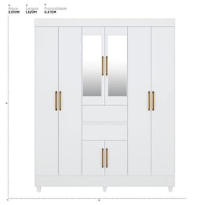 O Guarda-Roupa Munique oferece cabideiros, prateleiras amplas, espaço para sapatos e gavetas externas para roupas íntimas. Com espelho nas portas e pés em PVC, ele garante organização, estilo e praticidade para seu quarto.