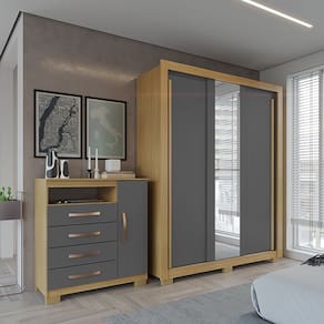 Oferecemos um kit exclusivo que combina um Guarda Roupa de 3 portas deslizantes com espelho e uma Cômoda, perfeito para otimizar o espaço e o estilo do seu quarto.