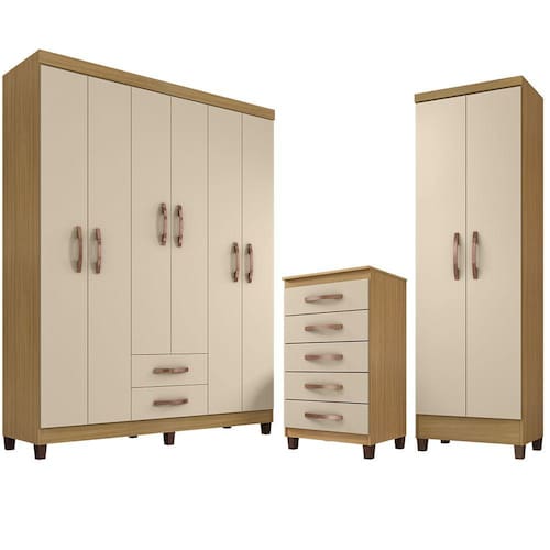 Outros recursos: Produto com corrediças, dobradiças e cabideiro metálicas. Puxadores em pvc Bronze.