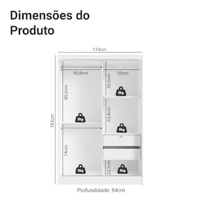 O Guarda-Roupa do conjunto possui duas portas de correr com trilhos metálicos e deslizamento suave. Os puxadores são em alumínio, mais resistentes para o uso diário.