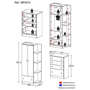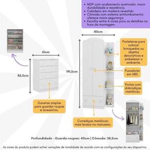 Dimensões do produto montado: Guarda-Roupas - Altura: 191,5cm | Largura: 80cm | Profundidade: 40cm Cômoda - Altura: 85,5cm | Largura: 61cm | Profundidade: 38,5cm *Você pode consultar as medidas detalhadas na imagem técnica do produto.