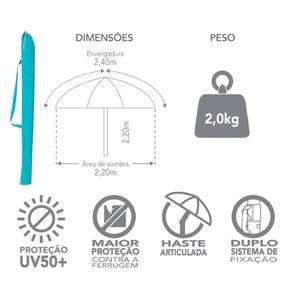 Possui saída de ar no topo que auxilia na estabilidade e sua haste em alumínio vem com tem alavanca e duplo pino de fixação, o que garante maior segurança evitando que a parte superior do guarda-sol se solte. O guarda-sol é articulável, permitindo que você ajuste a posição como preferir.
