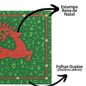 Leve praticidade e um toque festivo à sua mesa posta com o guardanapo de papel natalino estampado nas cores verde e vermelho, com desenho de rena. Um item indispensável para completar a decoração de ceias, almoços, jantares e confraternizações com muito estilo e charme.