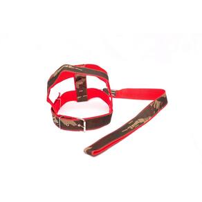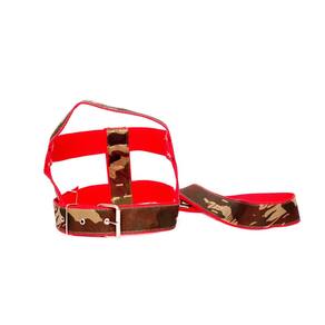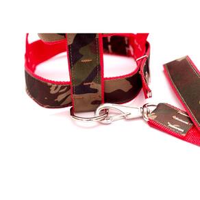 Peitoral de nylon 40 mm camuflado com fita de nylon vermelha e com fivela de metal; Guia de nylon 40 mm xadrez; Mosquetão com trava de segurança; Cor camuflado com fita de nylon em vermelho. Tamanho: nº10. Praticidade, conforme para seu pet de médio e grande porte. Passei com estilo e elegância. Medidas aproximadas: Pescoço 69 cm. Tórax 77 à 93 cm. Guia 60 cm. Marca: Nica pet