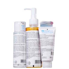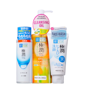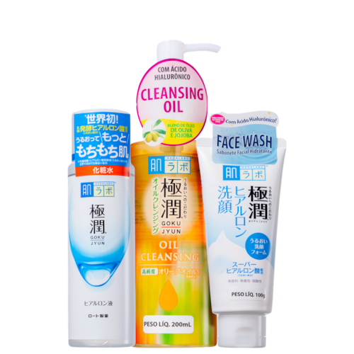 Kit com loção hidratante, sabonete e óleo de limpeza facial. Hada Labo Gokujyun Hidra & Clean remove impurezas e hidrata profundamente o rosto.