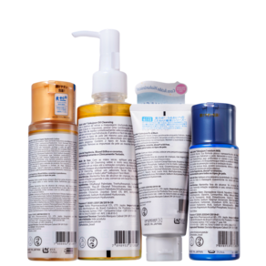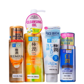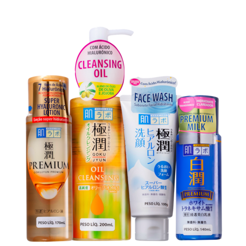 Kit facial com sabonete, óleo de limpeza, loção hidratante e hidratante clareador. Hada Labo Gokujyun Shirojyun Hyaluronic purifica e hidrata profundamente.
