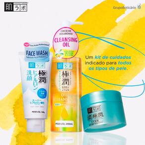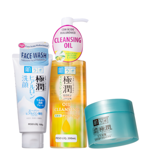 Kit com hidratante, sabonete e óleo de limpeza facial para todos os tipos de pele, inclusive mistas e oleosas. Hada Labo Gokujyun Trio remove impurezas e maquiagem, inclusive à prova d'água, com hidratação e proteção para o seu rosto.
