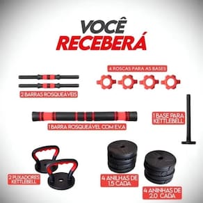 Kit Halteres e Anilhas Kettlebell Ajustáveis Academia Fit 6 em 1 - 15kg Versatilidade, praticidade e eficiência em um só equipamento O Kit de Halteres Ajustáveis Academia Fit 6 em 1 é a solução ideal para treinos completos em casa. Com design inteligente e multifuncional, o kit permite a montagem de diferentes equipamentos em um único conjunto, otimizando espaço e ampliando suas possibilidades de exercício. Características: Sistema 6 em 1: Permite montar 2 halteres, barra longa halter tipo barra , kettlebell, apoio para flexão e até barra com pegada martelo, oferecendo variedade para treinos de força e funcional. Peso Ajustável: Acompanha anilhas que possibilitam a personalização da carga de acordo com seu nível de condicionamento e tipo de exercício. Material Reforçado: Anilhas revestidas em PVC com enchimento de cimento compactado ou conforme modelo , oferecendo durabilidade, proteção ao piso e menos ruído durante o treino. Barras com Pegada Antiderrapante: Cabos emborrachados e confortáveis para maior segurança e estabilidade durante os movimentos. Conexão Rápida: Sistema de rosqueamento simples para troca rápida de função halter, barra, kettlebell, etc. , tornando o treino mais dinâmico e prático. Compacto e Funcional: Ideal para treinos em casa ou em ambientes com pouco espaço. O kit pode ser desmontado e armazenado com facilidade. Transforme seu treino com o Kit 6 em 1 de Halteres Ajustáveis. Um verdadeiro combo fitness para turbinar sua rotina de exercícios sem sair de casa Especificações: Itens inclusos: 4x anilhas de 2,0kg; 4x anilhas de 1,5kg; 2x barras curtas com pegada emborrachada; 1x barra de conexão para halter longo; 2x alça para montagem de kettlebell; 4x Travas de segurança; 1x barra de rosqueável Marca: Não Informado