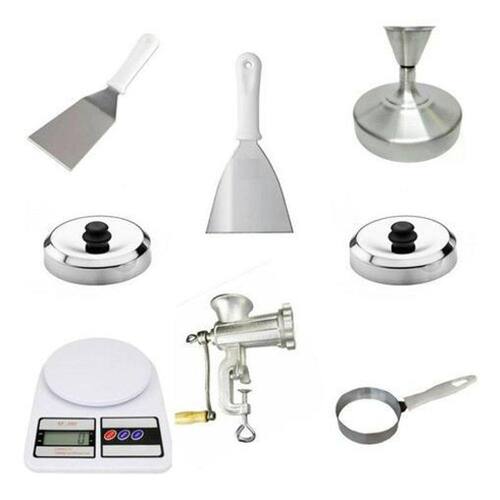 Itens que acompanham kit:1- Modelador hambúrguer material Aluminio nao contem partes plasticasMed. Aprox.: 12 cm diâmetro espessura = 2 cm1- Modelador hambúrguerMed. Aprox.: 14 cm diâmetro espessura = 2 cm2- Abafador em alumínioMed. Aprox.: 16 cm diâmetro x 3,5cm altura1- Modelador ovosMaterial: aço inox, med. Aprox.: diâmetro: 10 cm, altura: 2 cm1- Espátula curvaMed. Aprox.: 27 comprimento x 90 mm largura1- Espátula retaMed. Aprox.: 25 comprimentos x 100 mm largura1- Balança digital de alta precisãoPesa de 1 grama até 10 kg.1- Moedor de carneFicha técnica- Com suporte para molho: Não- Modelo: Diversos- Material: Metal/Plástico- Unidades por embalagem: 1- Diâmetro inferior: 12 cm