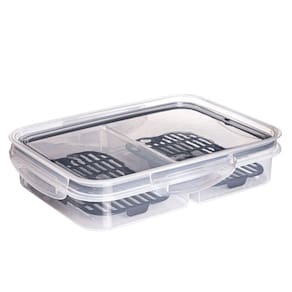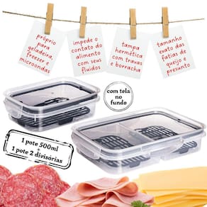 Kit com 2 potes herméticos retangulares, sendo 1 porta frios com duas divisórias e 1 pote com capacidade para 500ml, conforme especificações a seguir: