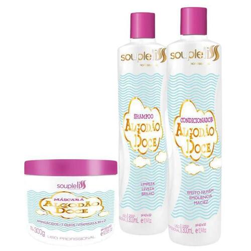 Souple liss kit algodão doce 3 produtos pequenos A linha algodão doce da souple liss professional proporciona aos fios uma restauração completa dos fios, devolvendo brilho, maciez e nutrição sem pesar os fios, promovendo o efeito núvem leveza e sedosidade. Sua fórmula contem 7 óleos essenciais, aminoácidos além das vitaminas a, b5 e d que promovem uma reconstrução completa, devolvendo todos nutrientes perdidos durante procedimentos químicos ou pelo desgaste mecanico causados por chapinhas, secadores e escovas. Conselho de aplicação: Lavar os cabelos com o shampoo algodão doce massageando o couro cabeludo suavemente com as pontas dos dedos, enxaguar. Em seguida, com os cabelos úmidos, aplicar a mascara algodão doce e deixar agir por 10 minutos e enxaguar bem. Aplicar o condicionador nos cabelos já nutridos com máscara, do comprimento até as pontas, massageando os fios com suavidade para o perfeito selamento das cutículas. Após isso enxaguar e finalizar como preferir. Resultado: Cabelos com brilho, leveza, maciez e com aspecto e efeito nuvem. Contém: 01- souple liss algodão doce - shampoo 300ml 01- souple liss algodão doce - condicionador 300ml 01- souple liss algodão doce - máscara 300g