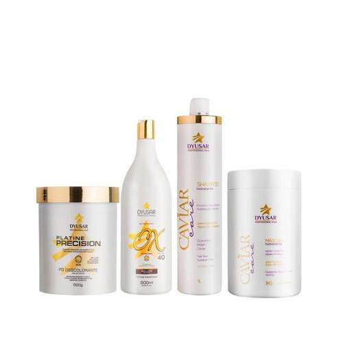 O pó descolorante platine precision white abre até 10 tons e proporciona um resultado uniforme, proteção, hidratação, sedosidade e brilho. modo de usar: acrescente a medida desejada do pó descolorante em um recipiente não metálico. Adicione o oxidante aos poucos e misture até formar um creme homogêneo, sempre na proporção 1: 2 uma medida de pó para duas medidas de ox . Siga rigorosamente as instruções de uso e faças testes de toque e mechas antes de aplicar. Após o término do tempo de ação, enxágue bem com água morna e lave os cabelos como de costume. Hidratar para melhor resultado. Teste de mecha: separe uma mecha fina do alto da cabeça, misture um pouco do produto e aplique na mecha, deixando o tempo de ação indicado e então a lave. Respeite a proporção utilizada na prova do toque. Se o cabelo ficar quebradiço ou houver aquecimento, é sinal de que o seu cabelo não se encontra em condições para o uso do produto. Atenção não utilize água oxigenada acima de 13 volumes para clareamento de pelos do corpo sem proteção prévia da pele.315844/2018-31 a oxidante estabilizada de 40 volumes da dyusar cosméticos Possui fórmula estabilizada, cremosa e perfumada e proporciona uniformidade e brilho ao resultado. Observação: usar luvas apropriadas. Respeitar o tempo de pausa. Respeitar os oxidantes recomendados. Não utilizar ferramentas metálicas. Não deixar escorrer o produto no couro cabeludo. Tempo de uso: até 50 minutos. Este produto deve ser utilizado apenas por um cabeleireiro. Modo de uso: misturar a emulsão oxidante com a tintura ou descolorante, conforme as proporções de diluição aconselhadas para cada tipo de produto.775961/2020-74 O shampoo hidratante caviar care 1l Foi desenvolvido para todos os tipos de cabelos, proporciona limpeza equilibrada devolvendo aos cabelos seu nível de hidratação natural enquanto repara e hidrata. Elaborado com queratina, argan e caviar. Promove reparação e hidratação, confere fios revitalizados, macios, maleáveis, com maior resistência e brilho natural e renovado. Livre de sal cloreto de sódio e parabenos. Modo de usar: aplicar sobre os cabelos molhados e lavar ligeiramente a primeira vez a fim de remover os resíduos que se opõem a formação da espuma. Enxaguar e reaplicar o shampoo, massageando o couro cabeludo suavemente até formar uma espuma rica e cremosa. deslizar a espuma para pontas. Enxaguar e condicionar a seguir.602658/2018-39 A máscara hidratante caviar care dyusar 1kg Desenvolvida especialmente para todos os tipos de cabelos, auxilia a repor os nutrientes perdidos por processos químicos e agressões externas enquanto repara e hidrata. Elaborada com queratina, argan e caviar, possui ação reparadora, hidratante e nutritiva. Promove reposição dos nutrientes vitais do cabelo, desembaraço, reduz o frizz, proporcionando cabelos macios, sedosos e com brilho intenso. Livre de parabenos. Modo de usar: aplicar sobre os cabelos molhados e limpos. Começar pelas pontas, massageando suavemente os cabelos e deslizando os fios entre os dedos até que estejam desembaraçados. Deixe agir de 5 a 10 minutos e enxaguar bem.602669/2018-92