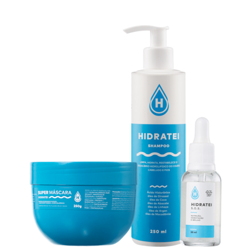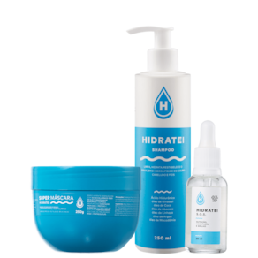 Kit com shampoo, máscara capilar e fluido de tratamento. Hidratei S.O.S Super