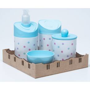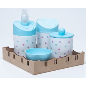 Kit Organizador para bebê c/bandeja em MDF. Cor do Pote: BRANCO PADRÃO Tampas: AZUL MATERIAL DOS POTES: ACRÍLICO MATERIAL DA BANDEJA: MDF Kit acompanha: - 1 bandeja de madeira em MDF. - 1 porta sabonete / álcool gel - 1 molheira - 1 porta algodão - 1 porta cotonete MEDIDAS DA BANDEJA EM MDF: Diâmetro: 19,5x19 cm Altura: 5x8cm MEDIDA DOS POTES: Porta algodão/cotonete: 8x10,5 cm Porta sabonete líquido: 12x21 cm Molheira: 8x5 cm Marca: Doya Kids