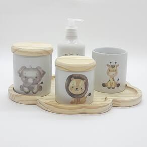 Kit higiene bebê 5 peças Safari - Porta Pente, potes e porta álcool - Peças porcelana bandeja e tampas pinusPeças muito resistentes, feitas com esmalte queimado em alta temperatura. Peças para armazenamento de cotonetes, algodão, água, etc.Dimensões (AxL): Pote Maior 9,5cm x 8,5cm, capacidade de 400ml. Pote Menor 7,5cm x 8,5cm, capacidade de 250ml. Porta sabonete Liquido/álcool gel: capacidade 300ml Porta Pente: 9cm x 8,5cm, capacidade de 400 mlBandeja de apoio: (AxLxC) 2cm x 22cm x 30cm OBS: Por se tratar de madeira de pinus natural, pode existir pequenas variações na tonalidade das cores da madeira. A tampa é apenas colocada por cima, sendo assim não oferece nenhuma trava de vedação. As peças podem sofrer pequenas alterações de tonalidade devido a diferentes lotes de queima Os bichos a serem enviados na compra são aleatórios conforme disponibilidade no momento. Opções: Elefante, Girafa, Leão, Zebra e Macaco. (faixa com os 5 bichos exclusivamente no porta alcool) Caso queira um deles em especifico, nos envie mensagem no pedido ou pelo canal de mensagens com a loja, disponível no marketplace. Embalagem contem 5 peças Marca: Antilope Decor Porcelanas