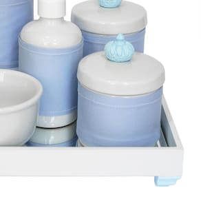 Aposte nesse kit higiene que foi desenvolvido para facilitar a vida das mamães e papais na hora de higienizar o bebê Produzido com materiais de alta qualidade, o kit conta com bandeja espelhada e porcelana de qualidade. Além disso, é um lindo item decorativo que irá encantar a todos Dados TécnicosKit higiene com bandeja de MDF em pintura branca com detalhe azul, fundo de espelho e decoração com resinas de Coroa azul nas tampas dos potes com capas Itens Inclusos no Kit01 Bandeja com espelho01 Garrafa Térmica - Marca Termolar - 250 ml01 Pote grande em porcelana branca com tampa01 Pote pequeno em porcelana branca com tampa01 Molhadeira em porcelana branca01 Porta Álcool-Gel/ Sabonete Líquido em porcelana branca01 Conjunto de 4 capas em tecido e tiras aderentes para garrafa térmica, pote grande, pote pequeno e porta álcool-gel MedidasBandeja: 25 cm de largura, 25 cm de comprimento e 4,5 cm de alturaGarrafa Térmica: 7,5 cm de diâmetro e 18 cm de alturaPote Grande: 9 cm de diâmetro e 10 cm alturaPote Pequeno: 9 cm de diâmetro e 8,5 cm alturaMolhadeira: 10,5 cm de diâmetro e 6,5 cm de alturaPorta Álcool-Gel/Sabonete Liquido: 6,5 cm de diâmetro e 15 cm de altura
