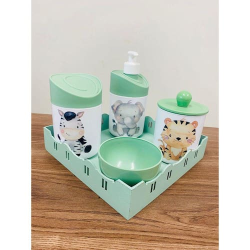 Kit Organizador para bebê c/bandeja Cor dos Potes: BRANCO PADRÃO MATERIAL DOS POTES: ACRÍLICO MATERIAL DA BANDEJA: MDF Kit acompanha: - 1 bandeja de madeira em MDF - 1 porta sabonete / álcool gel - 1 molheira - 1 porta algodão - 1 porta cotonete MEDIDAS DA BANDEJA EM MDF: Diâmetro: 20x20cm MEDIDA DOS POTES: Porta algodão/cotonete: 8x10,5 cm Porta sabonete líquido: 12x21 cm Molheira: 8x5 cm Ean: 7898901200109