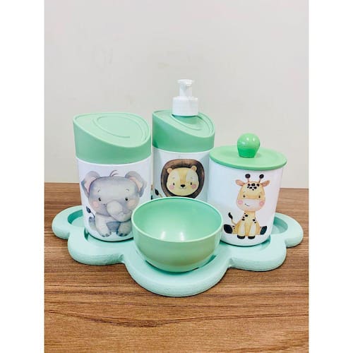 Kit Organizador para bebê c/bandeja Cor dos Potes: BRANCO PADRÃO MATERIAL DOS POTES: ACRÍLICO MATERIAL DA BANDEJA: MDF Kit acompanha: - 1 bandeja de madeira em MDF - 1 porta sabonete / álcool gel - 1 molheira - 1 porta algodão - 1 porta cotonete MEDIDAS DA BANDEJA EM MDF: Diâmetro: 30x22 cm MEDIDA DOS POTES: Porta algodão/cotonete: 8x10,5 cm Porta sabonete líquido: 12x21 cm Molheira: 8x5 cm Ean: 7898901200253