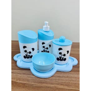 Kit Organizador para bebê c/bandeja em MDF. Cor do Pote: BRANCO PADRÃO Tampas: AZUL MATERIAL DOS POTES: ACRÍLICO MATERIAL DA BANDEJA: MDF Kit acompanha: - 1 bandeja de madeira em MDF. - 1 porta sabonete / álcool gel - 1 molheira - 1 porta algodão - 1 porta cotonete MEDIDAS DA BANDEJA EM MDF: Diâmetro: 19,5x19 cm Altura: 5x8cm MEDIDA DOS POTES: Porta algodão/cotonete: 8x10,5 cm Porta sabonete líquido: 12x21 cm Molheira: 8x5 cm Marca: Doya Kids
