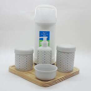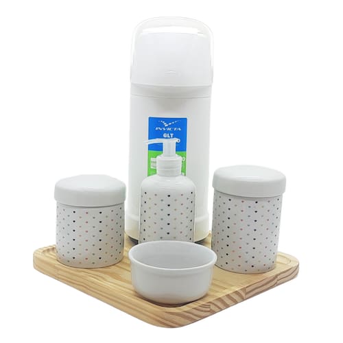 Kit higiene Poá 6 pçs - Molhadeira Branca - Garrafa 500ml - Porcelana Peças muito resistentes, feitas com esmalte queimado em alta temperatura. Peças para armazenamento de cotonetes, algodão, água, etc. Os decalque são aplicados e queimados junto à peça, o que os funde a peça, dão brilho e não desbotam com o tempo. Dimensões (AxL): Pote Maior 9cm x 8,5cm, capacidade de 400 ml. Pote Menor 7cm x 9cm, capacidade de 250 ml. Porta sabonete Liquido/álcool gel: capacidade 300ml Molhadeira Branca: 120ml Garrafa térmica: 500ml Bandeja de pinus (CxLxA): 25cm x 25cm x 1,7cm OBS: Por se tratar de madeira de pinus natural, pode existir pequenas variações na tonalidade das cores da madeira. A tampa é apenas colocada por cima, sendo assim não oferece nenhuma trava de vedação. As peças podem sofrer pequenas alterações de tonalidade devido a diferentes lotes de queima Embalagem contem 6 peças Marca: Antilope Decor Porcelanas