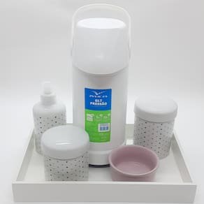 Kit higiene Poá 6 peças Porcelana - Bandeja Branca - Molhadeira Rosa Peças muito resistentes, feitas com esmalte queimado em alta temperatura. Peças para armazenamento de cotonetes, algodão, água, etc. Os desenhos são decalque aplicados e queimados junto à peça, o que os funde a peça, dão brilho e não desbotam com o tempo. Dimensões (AxL): Pote Maior 9cm x 8,5cm, capacidade de 400 ml. Pote Menor 7cm x 9cm, capacidade de 250 ml. Porta sabonete Liquido/álcool gel: capacidade 300ml Garrafa térmica; Capacidade 500ml Molhadeira: Capacidade 120ml Bandeja: (AxLxC) 3,5cm x 20cm x 34,5cm OBS: A tampa é apenas colocada por cima, sendo assim não oferece nenhuma trava de vedação. As peças podem sofrer pequenas alterações de tonalidade devido a diferentes lotes de queima Embalagem contem 6 peças