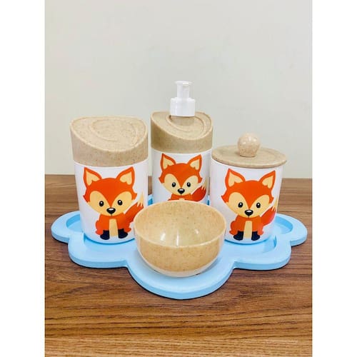 Kit Organizador para bebê c/bandeja Cor do Pote: BRANCO PADRÃO MATERIAL DOS POTES: ACRÍLICO MATERIAL DA BANDEJA: MDF Kit acompanha: - 1 bandeja de madeira em MDF - 1 porta sabonete / álcool gel - 1 molheira - 1 porta algodão - 1 porta cotonete MEDIDAS DA BANDEJA EM MDF: Diâmetro: 30x22cm MEDIDA DOS POTES: Porta algodão/cotonete: 8x10,5 cm Porta sabonete líquido: 12x21 cm Molheira: 8x5 cm Ean: 7898901269144
