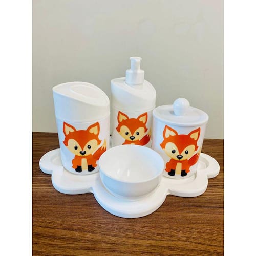 Kit Organizador para bebê c/bandeja Cor do Pote: BRANCO PADRÃO MATERIAL DOS POTES: ACRÍLICO MATERIAL DA BANDEJA: MDF Kit acompanha: - 1 bandeja de madeira em MDF - 1 porta sabonete / álcool gel - 1 molheira - 1 porta algodão - 1 porta cotonete MEDIDAS DA BANDEJA EM MDF: Diâmetro: 30x22cm MEDIDA DOS POTES: Porta algodão/cotonete: 8x10,5 cm Porta sabonete líquido: 12x21 cm Molheira: 8x5 cm