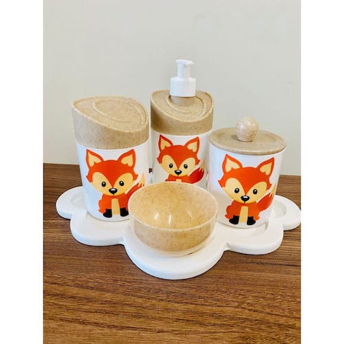 Kit Organizador para bebê c/bandeja Cor do Pote: BRANCO PADRÃO MATERIAL DOS POTES: ACRÍLICO MATERIAL DA BANDEJA: MDF Kit acompanha: - 1 bandeja de madeira em MDF - 1 porta sabonete / álcool gel - 1 molheira - 1 porta algodão - 1 porta cotonete MEDIDAS DA BANDEJA EM MDF: Diâmetro: 30x22cm MEDIDA DOS POTES: Porta algodão/cotonete: 8x10,5 cm Porta sabonete líquido: 12x21 cm Molheira: 8x5 cm