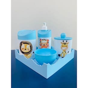 Kit higiêne de bebê Cor dos Potes: BRANCO Tampas: AZUL MATERIAL DA BANDEJA: MDF MATERIAL DOS POTES: ACRILICO Acomapanha: - 1 porta sabonete líquido/ porta álcool gel - 1 porta cotonete - 1 porta algodão - 1 molheira - 1 bandeja em MDF MEDIDAS DA BANDEJA EM MDF: Diâmetro: 19,5x19 cm Altura: 5x8cm MEDIDA DOS POTES: Porta algodão/cotonete: 8x10,5 cm Porta sabonete líquido: 12x21 cm Molheira: 8x5 cm Marca: Doya Kids