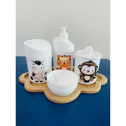 Kit Higiene Safari c/bandeja Nuvem Crua (Macaco, Zebra, Tigre)