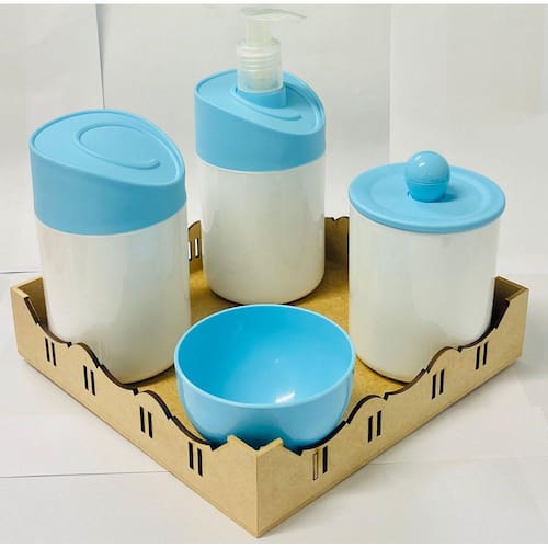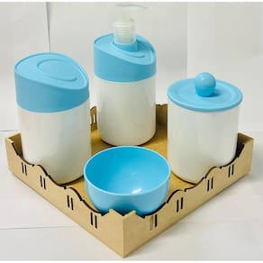 Kit Organizador para bebê c/bandeja em MDF. Cor do Pote: BRANCO PADRÃO Tampas: AZUL MATERIAL DOS POTES: ACRÍLICO MATERIAL DA BANDEJA: MDF Kit acompanha: - 1 bandeja de madeira em MDF. - 1 porta sabonete / álcool gel - 1 molheira - 1 porta algodão - 1 porta cotonete MEDIDAS DA BANDEJA EM MDF: Diâmetro: 19,5x19 cm Altura: 5x8cm MEDIDA DOS POTES: Porta algodão/cotonete: 8x10,5 cm Porta sabonete líquido: 12x21 cm Molheira: 8x5 cm Marca: Doya Kids