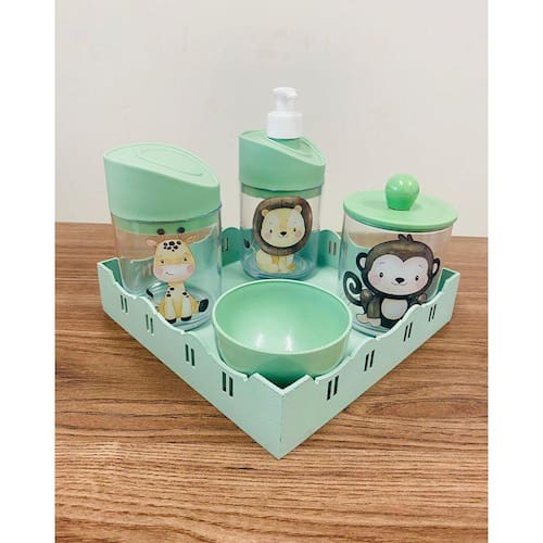 Kit Higiene Transparente Leão, Macaco, Girafa Verde C/Quadrada Verde
