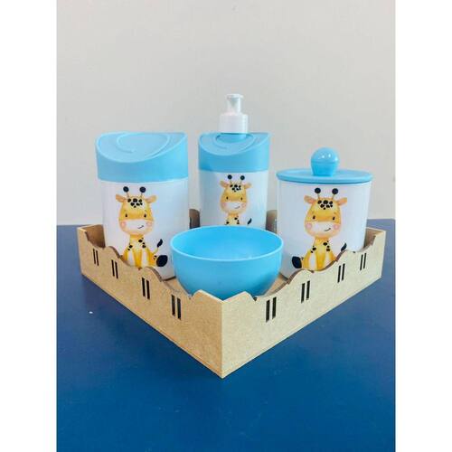 Kit higiêne de bebê Cor dos Potes: BRANCO Tampas: AZUL MATERIAL DA BANDEJA: MDF MATERIAL DOS POTES: ACRILICO Acomapanha: - 1 porta sabonete líquido/ porta álcool gel - 1 porta cotonete - 1 porta algodão - 1 molheira - 1 bandeja em MDF MEDIDAS DA BANDEJA EM MDF: Diâmetro: 19,5x19 cm Altura: 5x8cm MEDIDA DOS POTES: Porta algodão/cotonete: 8x10,5 cm Porta sabonete líquido: 12x21 cm Molheira: 8x5 cm Marca: Doya Kids