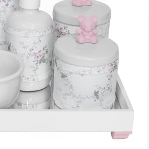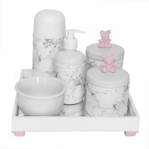 Aposte nesse kit higiene que foi desenvolvido para facilitar a vida das mamães e papais na hora de higienizar o bebê Produzido com materiais de alta qualidade, o kit conta com bandeja espelhada e porcelana de qualidade. Além disso, é um lindo item decorativo que irá encantar a todos Dados TécnicosKit higiene com bandeja de MDF em pintura branca com detalhe rosa, fundo de espelho e decoração com resinas de Ursinho rosa nas tampas dos potes com capas Itens Inclusos no Kit01 Bandeja com espelho01 Garrafa Térmica - Marca Termolar - 250 ml01 Pote grande em porcelana branca com tampa01 Pote pequeno em porcelana branca com tampa01 Molhadeira em porcelana branca01 Porta Álcool-Gel/ Sabonete Líquido em porcelana branca01 Conjunto de 4 capas em tecido e tiras aderentes para garrafa térmica, pote grande, pote pequeno e porta álcool-gel MedidasBandeja: 25 cm de largura, 25 cm de comprimento e 4,5 cm de alturaGarrafa Térmica: 7,5 cm de diâmetro e 18 cm de alturaPote Grande: 9 cm de diâmetro e 10 cm alturaPote Pequeno: 9 cm de diâmetro e 8,5 cm alturaMolhadeira: 10,5 cm de diâmetro e 6,5 cm de alturaPorta Álcool-Gel/Sabonete Liquido: 6,5 cm de diâmetro e 15 cm de altura