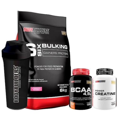 Kit Hipercalórico 6 Six Bulking 6kg + Power Creatina 100g + BCAA 4,5 100g + Coqueteleira - Bodybuilders Sabor: Baunilha. Six Bulking Gainers ProteinUm suplemento hipercalórico altamente energético com uma alta concentração de proteínas e carboidratos de alto valor biológico.Cerca de 80% do suplemento é composto por carboidratos de rápida digestão, sendo os demais proteínas, vitaminas e mineraisOs suplementos hipercalóricos foram desenvolvidos para pessoas com dificuldade em ganhar massa muscular, e peso corporal como aquelas com biotipo ectomorfo.Enquanto a maioria da população transforma o excesso de calorias dos alimentos em reservas de gordura, algumas pessoas usam esse excesso para manter seu metabolismo e, portanto, não conseguem transformá-lo em musculos.BCAA é uma combinação perfeita de três aminoácidos essenciais para o corpo, sendo eles: leucina, isoleucina e a valina. Esses aminoácidos são produzidos de forma natural, por isso o consumo de BCAA é importante para obter um bom desempenho atlético, sem deixar a saúde e a nutrição de lado. A combinação de nutrientes ricos em proteínas auxilia no ganho de massa muscular e reduz a sensação de cansaço no pós-treino.A Creatina é responsável pela produção de energia em células musculares, fornecendo muito mais disposição durante os treinos. A Creatina também ajuda a suprir as necessidades nutricionais do corpo humano, contribuindo com o ganho de massa muscular e auxiliando na recuperação dos músculos.