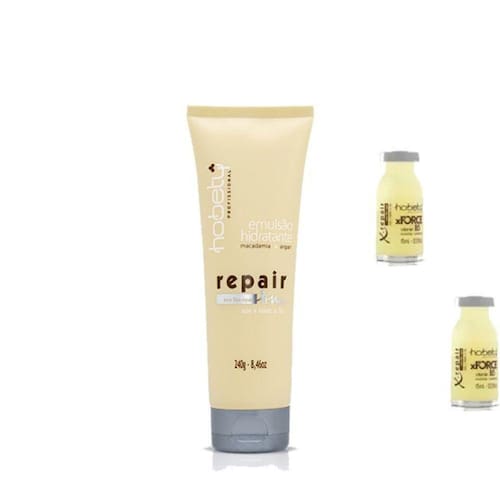 Kit Hobety Emulsão Repair Line + 2 Ampolas Reconstrutoras Tratamento indicado pra cabelos danificados e quimicamente tratados. O ativo nanofiber repair composto por macadâmia, argan e partículas de nutrientes, fortalece e repara o fio, revelando brilho intenso e alta sedosidade.Modo de usar:Aplicar o shampoo nos cabelos molhados massageando em movimentos circulares, enxágue e aplique a emulsão hidratante enluvando mecha a mecha, deixe agir por 10 minutos enxague e finalize como de costume.Hobety Ampola Unidose X Repair 16x15ml Vitamina B5 X Force Hobety XForce Vitamin B5 X Repair é um concentrado reestrurante para cabelos danificados e quimicamente tratados . A ação reparadora das vitaminas reconstroi as cuticulas do cabelo até o córtex e protege das agreções externas .Modo de usar :Aplique a Hobety XForce Vitamin B5 X Repair mecha a mecha passando o pente por todo o comprimento até as pontas. Sem tempo de pausa . Massageie e enxague. Ação instantânea . Finalize como de costume.Dica :Adicionando 01 ampola Hobety XForce Vitamin B5 X Repair na emulsão repair lineIndicado para todos os tipos de cabelosHobetyConcentrado reestrurante para cabelos danificados e quimicamente tratadosO kit contém:01 Emulsão hidratante repair line 240ml02 Hobety Ampola Unidose X Repair Reconstrutoras 15 ml cada